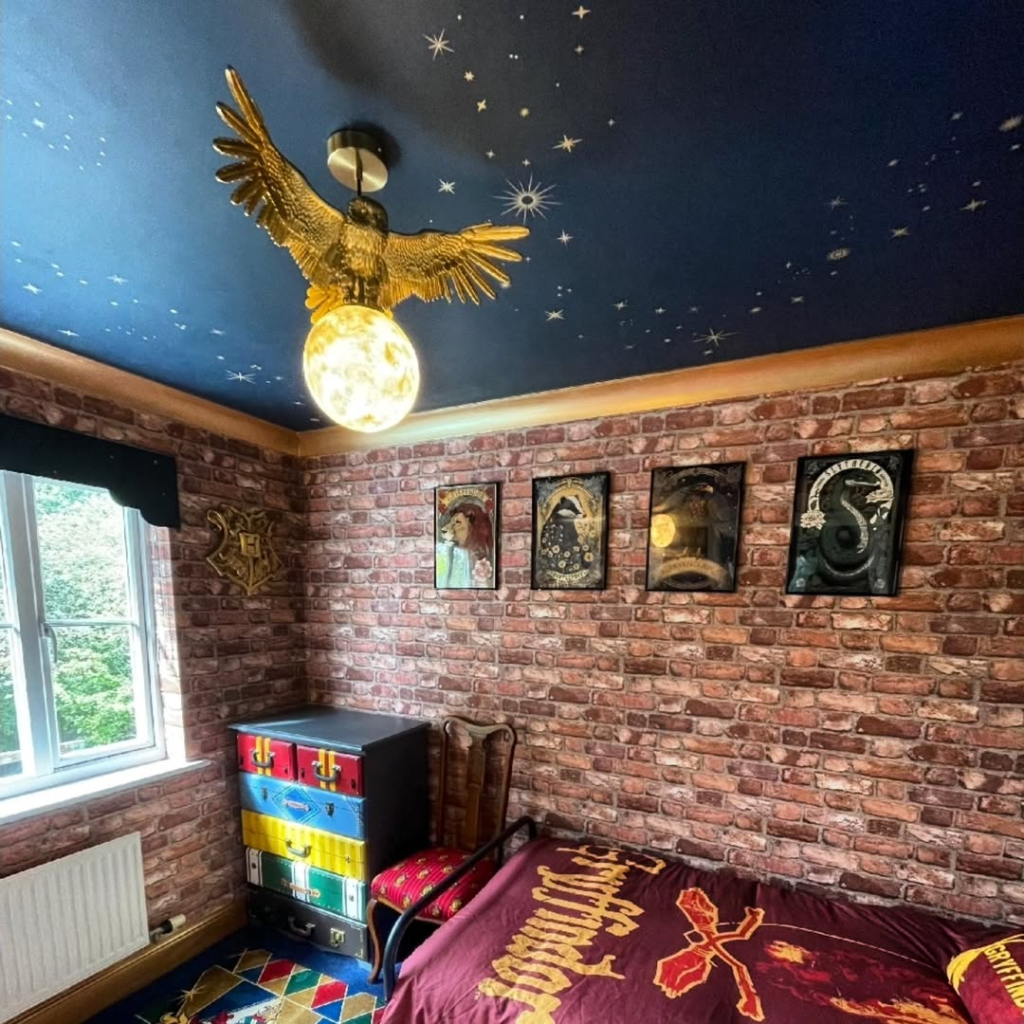 Imagine a bedroom that mirrors the enchanted ceiling of Hogwarts’ Great Hall. A deep blue ceiling sprinkled with painted stars transforms the space into a miniature magical universe. The golden winged light fixture, reminiscent of a soaring snitch, adds whimsy and charm above the bed. Paired with brick walls and cozy textures, this room feels intimate and magical. It’s perfect for sparking imagination while still providing a comfortable and functional bedroom for sleeping, studying, or curling up with a favorite wizarding book.