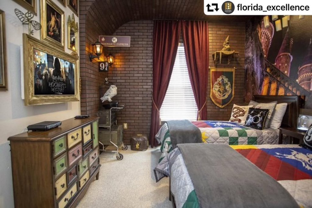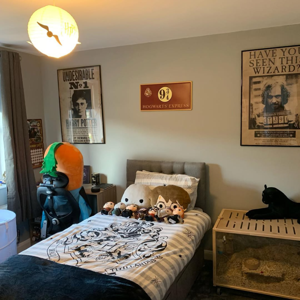 This bedroom proves you don’t need over-the-top décor to capture a magical vibe. Small details like framed prints, candles, and a casually placed sorting hat inject Harry Potter charm into a modern setup. The space feels clean and uncluttered, leaving plenty of room for personality to shine through. It’s perfect for older fans who want a nod to the wizarding world without sacrificing a contemporary bedroom feel. Magic and everyday life coexist here harmoniously, creating a serene yet enchanting retreat.