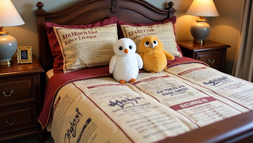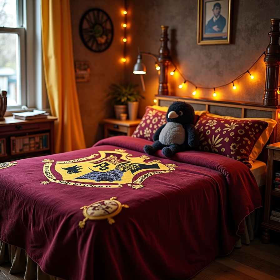 Sometimes, all it takes is one striking piece to anchor a magical room. A Hogwarts blanket covering the bed transforms it into a cozy tribute to the wizarding world. Complemented by a Hedwig plush and warm ambient lighting, the space feels inviting and nostalgic. This setup encourages curling up with books, imagining spell-casting adventures, or simply enjoying quiet, comforting moments. It’s a simple but effective way to celebrate the theme without overcrowding the room, keeping magic both tangible and cozy.