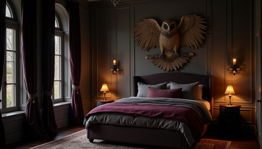 This room explores the darker, more mysterious side of Hogwarts-inspired design. Deep gray walls, soft candlelight, and vintage-style accents create the feel of a magical study. Owl artwork above the bed adds a touch of guardianship, completing the moody aesthetic. It’s perfect for quiet reading sessions or for fans who enjoy a more dramatic, enchanting ambiance. The balance of darkness and warmth gives the room depth, making it a magical haven that’s sophisticated, intimate, and utterly charming.