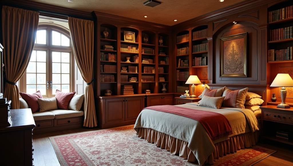 With built-in bookshelves and antique-style furniture, this room evokes the cozy academic feel of Hogwarts. Warm wood tones and soft bedding create a welcoming environment perfect for studying spells—or reading any fantasy novel. The window seat adds comfort, turning the room into a perfect retreat for quiet afternoons. This bedroom balances magical inspiration with practical living, ensuring it’s both functional and imaginative. It’s ideal for children who love to immerse themselves in stories and for those seeking a sophisticated nod to the wizarding world.