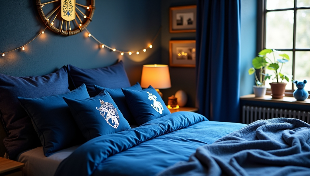 This bedroom celebrates Ravenclaw pride while remaining cozy and approachable. Deep blue bedding and crest details set a serene yet sophisticated tone, while layered pillows and soft lighting make the space inviting. The inclusion of small plush creatures adds personality without cluttering the room. It strikes the perfect balance between thematic design and everyday comfort, making it feel lived-in rather than staged. It’s ideal for fans who want their house spirit to shine subtly while maintaining a restful, welcoming atmosphere.