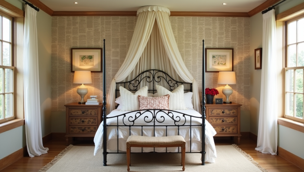 This room blends Hogwarts magic with cozy cottage charm. A delicate canopy over a vintage iron bed creates a fairytale feel, while printed book-page wallpaper adds whimsical nods to the wizarding stories. Light, airy colors keep the space bright and cheerful, making it approachable and inviting. It’s perfect for younger fans or anyone wanting a gentle magical aesthetic. The combination of soft textures, vintage details, and storybook-inspired elements results in a bedroom that feels enchanting, charming, and magical without being overbearing.