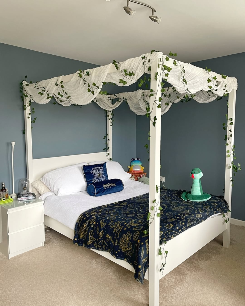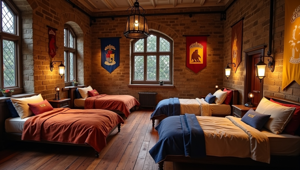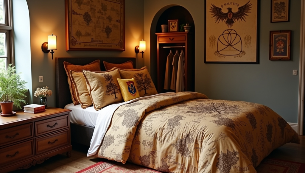 This room channels a secretive, magical corner of Hogwarts. A canopy bed draped with trailing ivy evokes a hidden greenhouse, while deep-toned bedding and subtle Slytherin accents keep the space playful yet mysterious. It’s a cozy, enchanting bedroom that sparks imagination while remaining comfortable. This design blends natural elements with magical details, perfect for fans who want a touch of the unexpected. The result is a charming, magical retreat that’s both whimsical and practical.