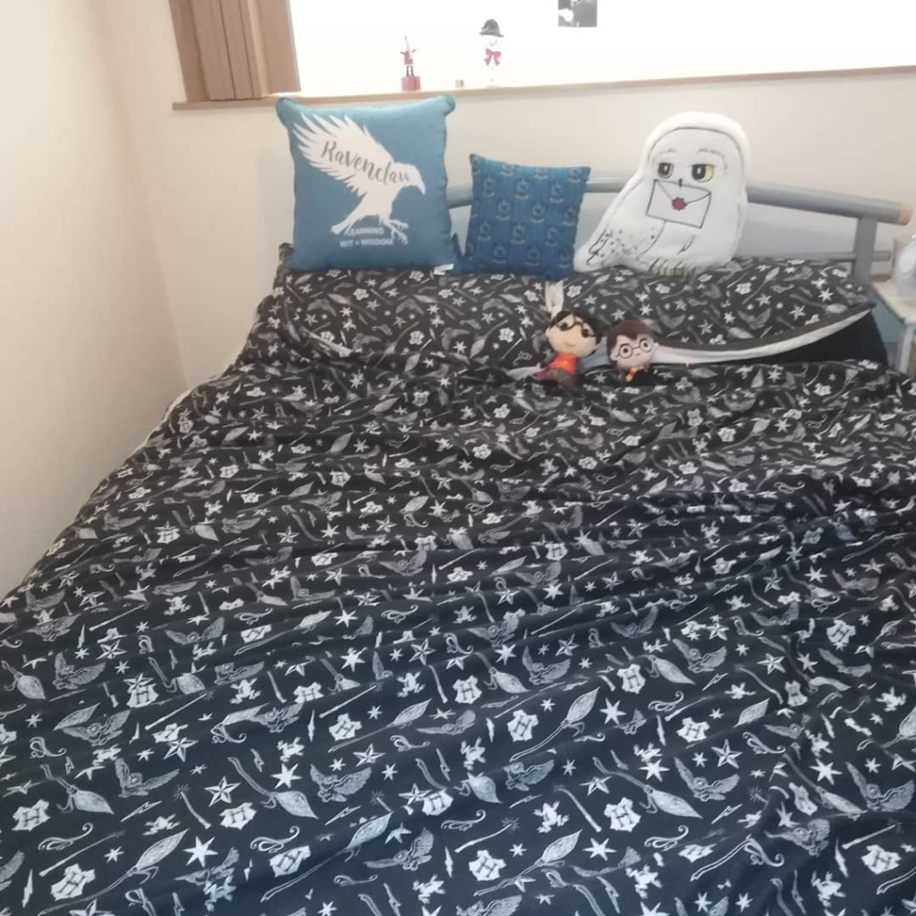This bedroom keeps wizarding charm simple but effective. Dark bedding patterned with magical icons adds subtle thematic detail, while a Ravenclaw pillow takes center stage. The room feels relaxed, comfortable, and functional, making it perfect for fans who enjoy the world of magic without overwhelming visuals. It’s ideal for creating a calm, cozy space while still showcasing personality. The design emphasizes comfort and subtle fandom pride, making it a welcoming retreat for study, rest, or imagination.