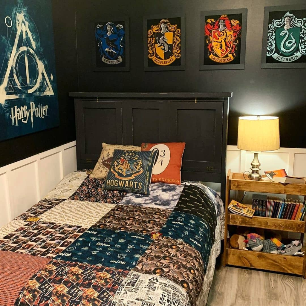 Dark walls give this bedroom an atmospheric, almost cinematic quality. Framed house crests above the bed provide a sense of pride and identity, while Deathly Hallows artwork glows subtly, adding drama and magic. The room feels like a personal wizarding study, perfect for quiet reflection, reading, or imaginative play. Balancing bold dark tones with warm accents ensures the space is inviting and functional. It’s a stylish, mature take on a Hogwarts-inspired bedroom for fans who appreciate mood and detail.