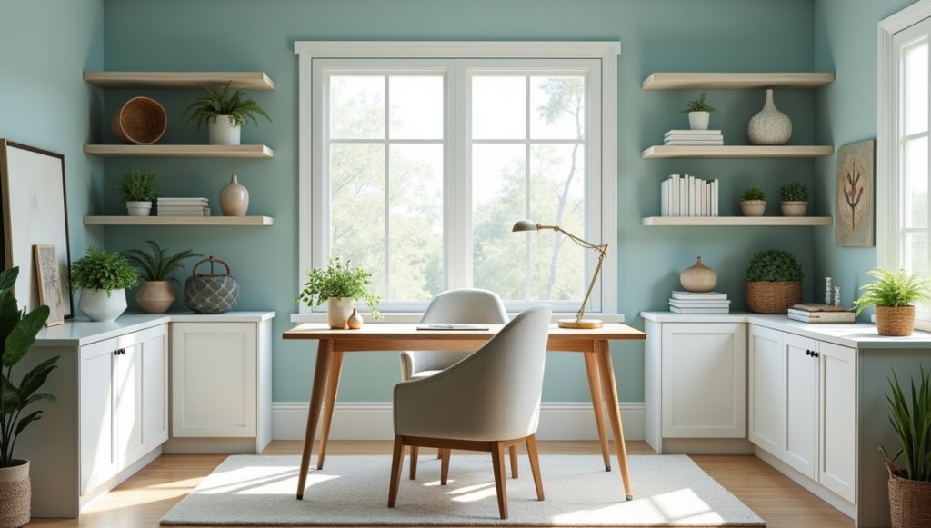 This home office captures a peaceful coastal mood through its soft blue-green walls, which create a refreshing and calming backdrop. The color palette feels light and airy, helping reduce stress while improving focus throughout the day. Built-in white shelves and cabinets provide plenty of storage space, ensuring everything has its place and clutter is kept to a minimum.
