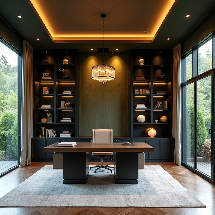 Tall black bookshelves display carefully chosen decor items, giving the office a curated and refined look. A textured olive green wall introduces depth and character, while layered lighting—including a statement chandelier and recessed fixtures—creates a warm and welcoming atmosphere.