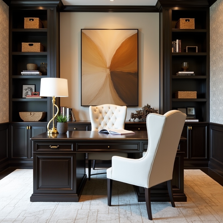 This office design stands out with its bold and refined aesthetic. A dark, eye-catching desk anchors the room, while a light-colored wingback chair creates a striking contrast that draws attention. Gold accents are used throughout the space, adding a sense of luxury without feeling excessive.