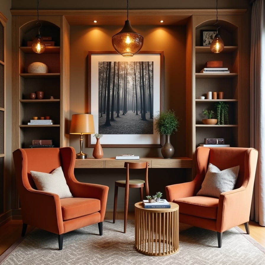 Warm tones take center stage in this inviting home office. Rust-colored armchairs create a comfortable seating area, enhanced by patterned throw pillows that add texture and visual appeal. A built-in desk and shelving unit provide both storage and functionality.