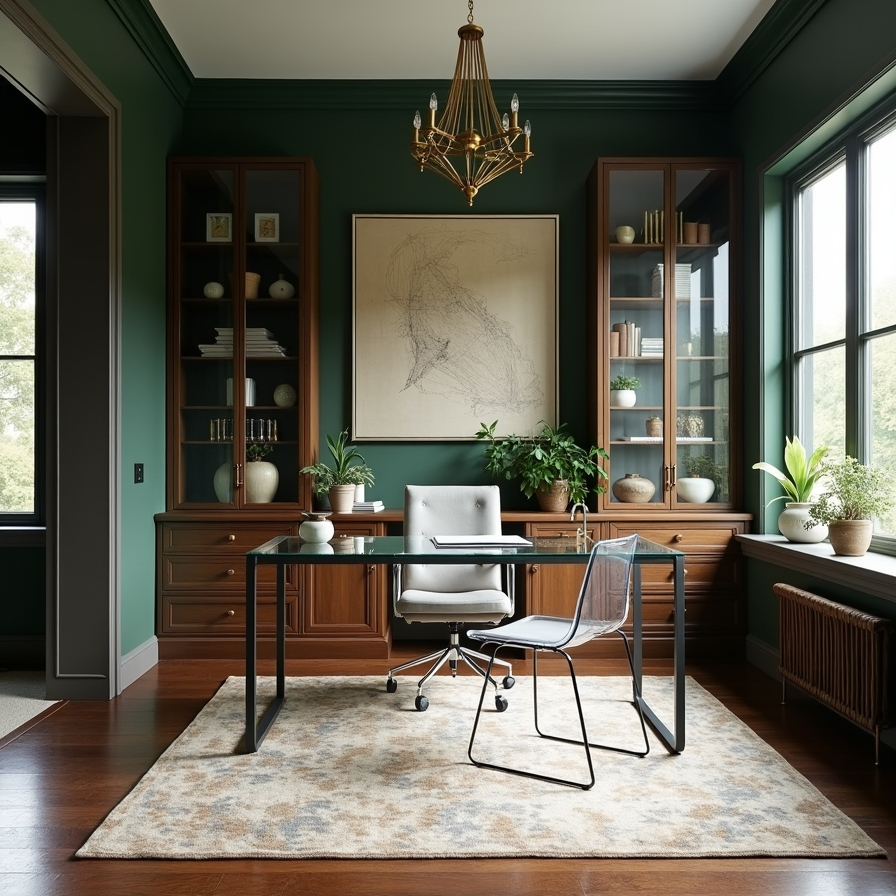 This office blends modern design with timeless elegance. Rich green walls and dark wood cabinetry create a warm and refined atmosphere. A sleek glass desk paired with transparent chairs introduces a contemporary contrast that keeps the space from feeling too heavy.