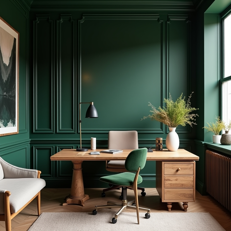 This office embraces a bold and moody aesthetic through its dark green accent wall, complete with structured paneling. The strong color choice creates a sense of depth and focus, making it ideal for concentration.