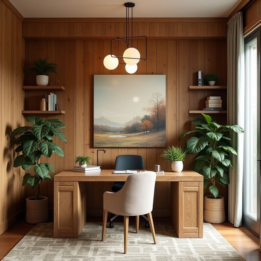 This office design combines rustic charm with modern touches. Wood-style wall paneling creates a cozy, welcoming atmosphere, while a distressed desk adds character. An abstract landscape painting introduces a refined element, balancing the rustic features.