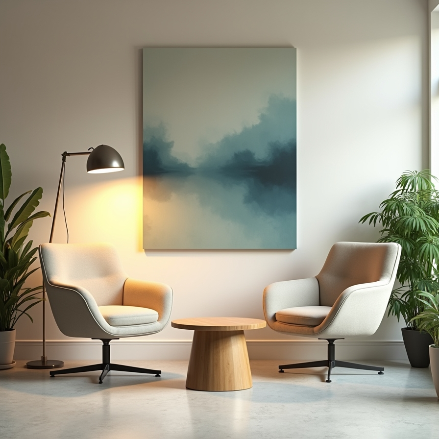 A large abstract painting serves as the main focal point, adding visual interest without overwhelming the design. A floor lamp provides warm lighting, enhancing the inviting atmosphere.