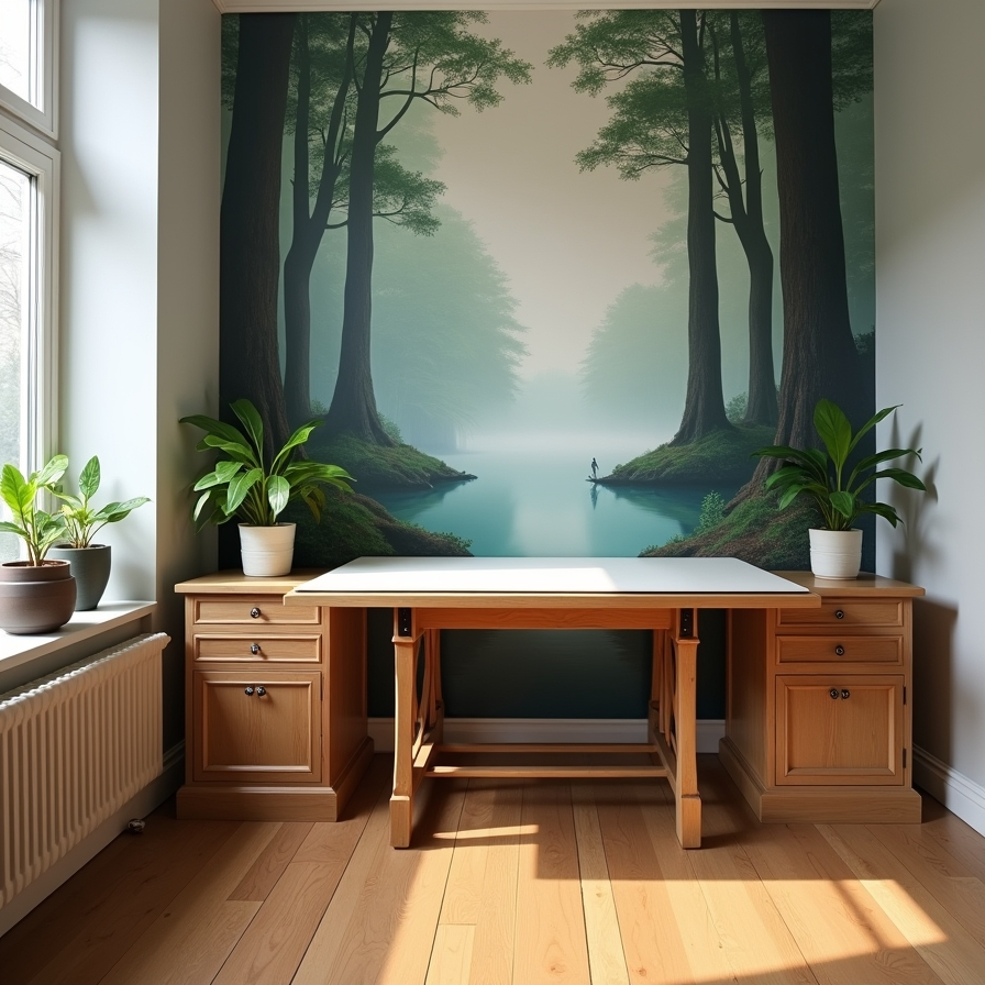 This office doubles as a creative studio, designed to inspire artistic expression. A large mural featuring a nature-inspired scene sets a calming tone and encourages creativity. The visual impact of the artwork makes the room feel unique and personalized.