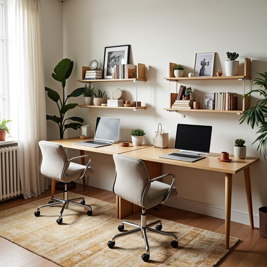 Large windows allow natural light to brighten the space, creating a pleasant work environment. This layout is ideal for partners, siblings, or coworkers who need a functional and stylish shared office.