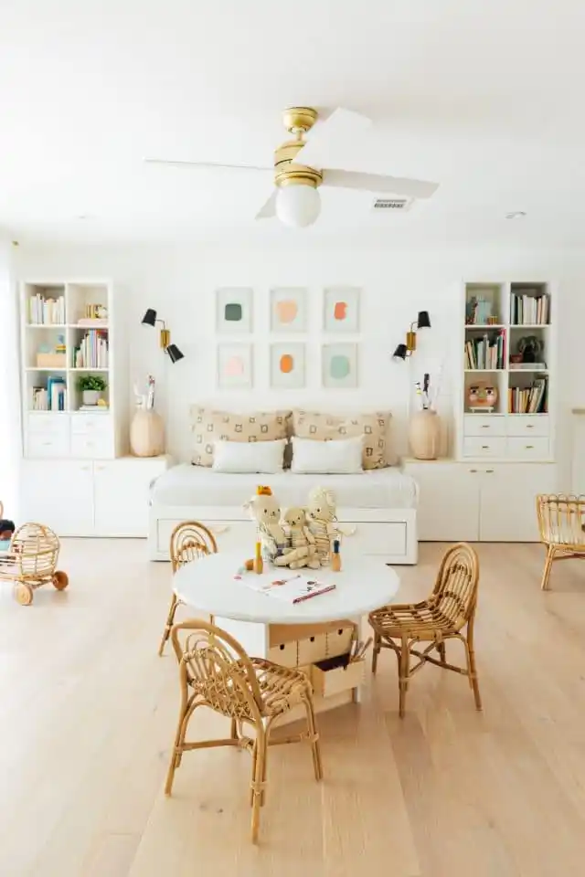 Custom hardware, decorative bins, and a simple craft table personalize the space without overwhelming it. The result is a balanced design that appeals to both children and adults.