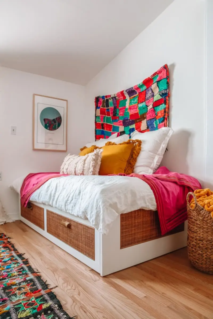 The IKEA BRIMNES daybed is valued for its versatility, expanding from a twin to a larger sleeping surface while offering built-in drawers. Adding rattan cane to its panels transforms the practical design into something more visually engaging.