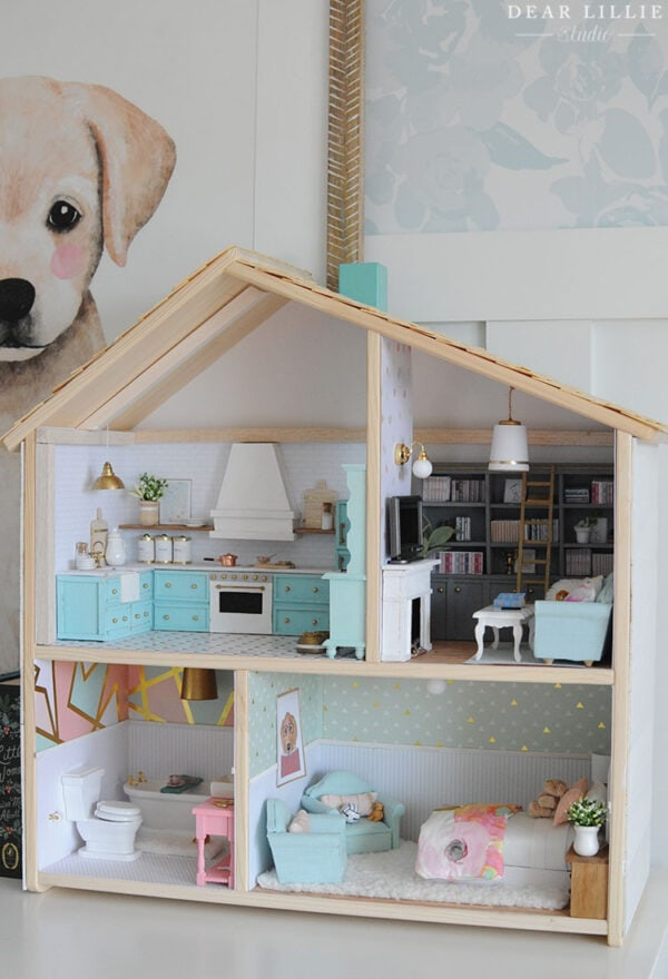 This inspiring makeover from Dove Cottage is a wonderful place to begin if you’re considering transforming your Ikea Flisat dollhouse. Using simple materials and Ikea’s own dollhouse furniture, they’ve created a bright, contemporary miniature home that feels stylish and realistic.