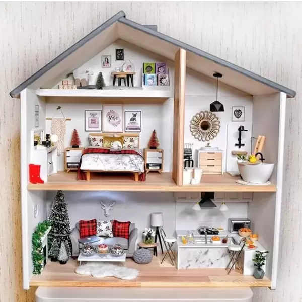 In this example, the home is styled for the holidays with miniature Christmas decorations, wreaths, and festive accessories. This idea keeps the dollhouse exciting throughout the year—simply update it to match different seasons or celebrations.