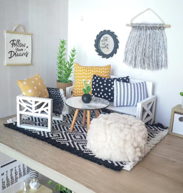 One key difference here is the use of more detailed, standalone dollhouse furniture pieces. Handmade miniature furniture—often available at affordable prices through small online shops—adds depth and realism. Mixing textures, patterns, and statement pieces creates a playful yet cohesive look that feels curated rather than cluttered.