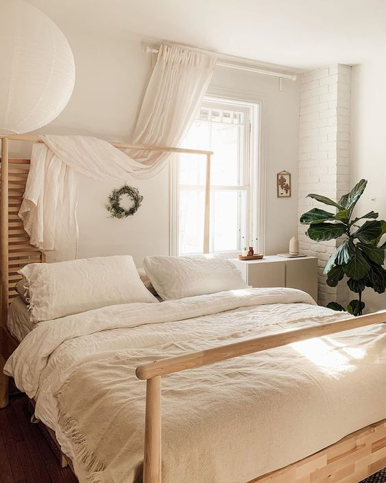 The semi-four-poster design offers visual interest without overpowering the room. Neutral bedding, natural textiles, and subtle accents like linen drapes over the posts create a cozy yet uncluttered space. Adding a fiddle leaf fig or other greenery enhances the connection to nature, which is central to Japandi interiors.