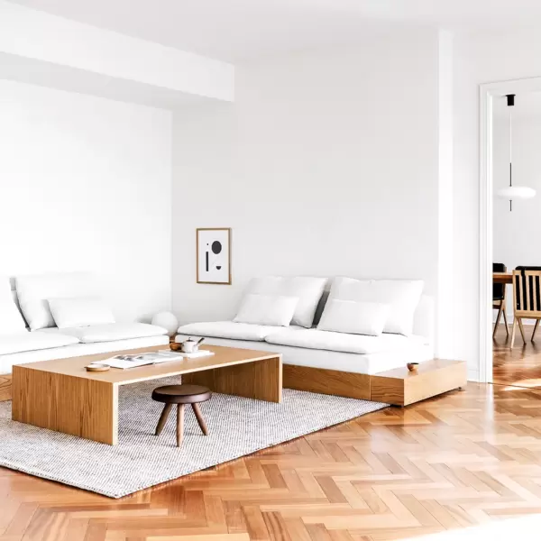 Even living room seating can be adapted to Japandi design. This Ikea Soderhamn sofa was modified with a wooden surround to create a low-profile, elegant look.