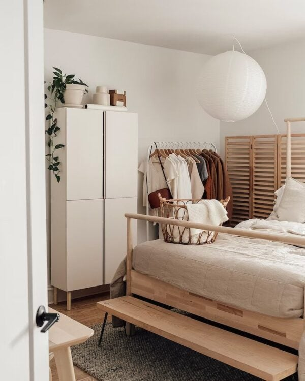 In another example from Brook & Peony, Ikea Ivar cabinets were converted into a simple, neutral wardrobe. The cabinets are painted to match the room’s muted color palette and elevated on a wooden base for elegance.
