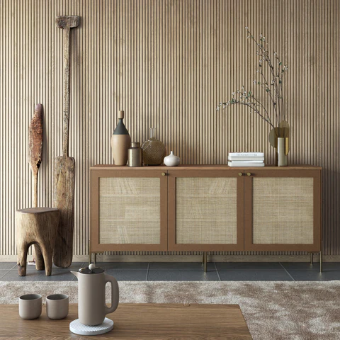 The unit is painted a soft, neutral grey, while cane panels replace standard doors, adding texture and natural warmth. Inside, the cabinet is styled simply and functionally, reflecting the Japandi ethos of elegance without excess. This is a perfect example of how reimagining an existing piece of furniture can create both beauty and practicality while keeping sustainability in mind.