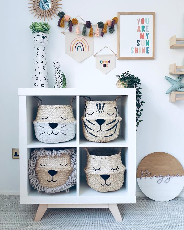 Adding woven baskets with hand-painted animal faces to Kallax cubbies introduces fun and character to any playroom. Made from natural seagrass, these baskets provide storage while adding texture and whimsy to the space.