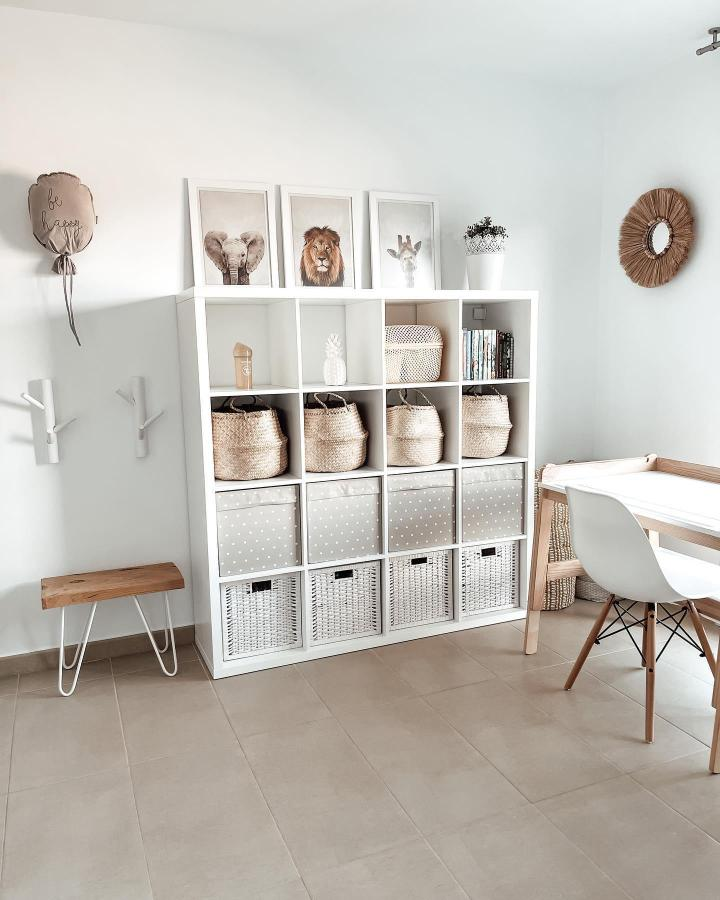 Using beige and white woven baskets in a Kallax unit creates a calm, airy playroom environment. Mixing textures, such as fabric bins and wicker baskets, adds visual interest without overwhelming the space.