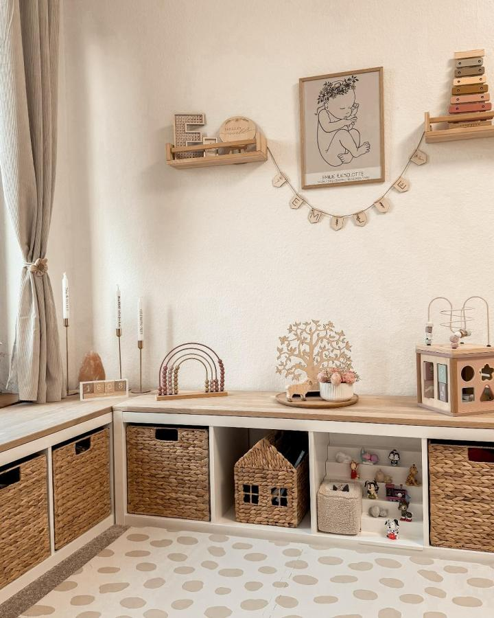 This simple tweak blends aesthetics with practicality, providing accessible storage while maintaining a warm, inviting playroom feel.