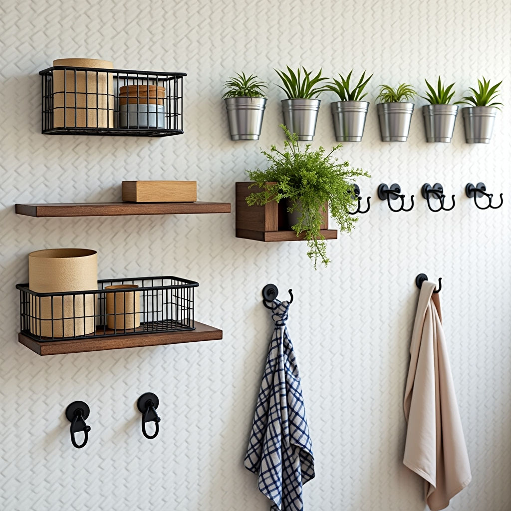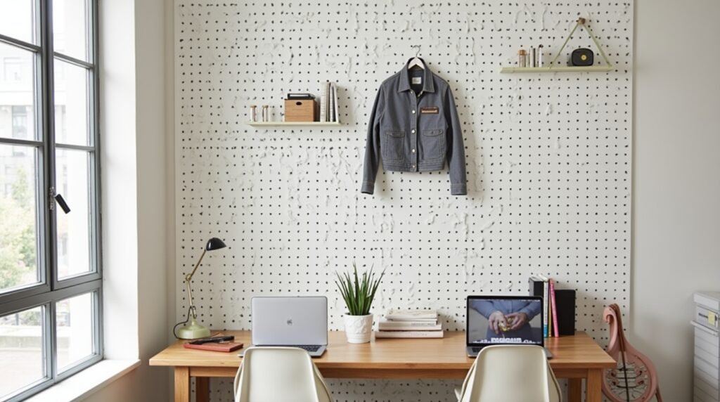 Adding metal baskets and wooden shelves to a pegboard makes it stylish and functional. Hooks keep rolls of paper organized, and small plants can be displayed on the shelf. Mixing wood and metal textures elevates the look from industrial to decorative.