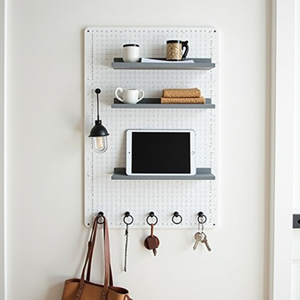 A white wall-mounted pegboard turns a hallway wall into a functional command station. Crisp white panels hold tablets, key rings, and small essentials without looking cluttered. Gray shelves are perfect for storing items like hand sanitizer and papers, while a tablet holder keeps devices at an ideal angle. Hooks at the bottom create a quick grab-and-go spot for keys, jewelry, or other daily items.