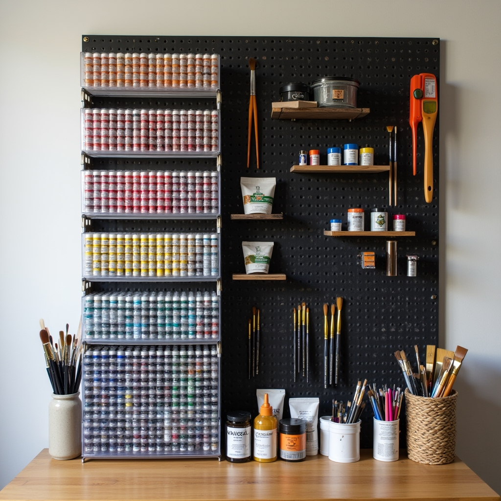 A black pegboard becomes a vertical storage powerhouse for paint bottles and brushes. Clear stackable drawers allow dozens of bottles to be visible at once, making color selection easy. Specialized holders keep brushes and tools organized, and small containers hold extra supplies. This approach maximizes vertical space, especially for small desk areas.
