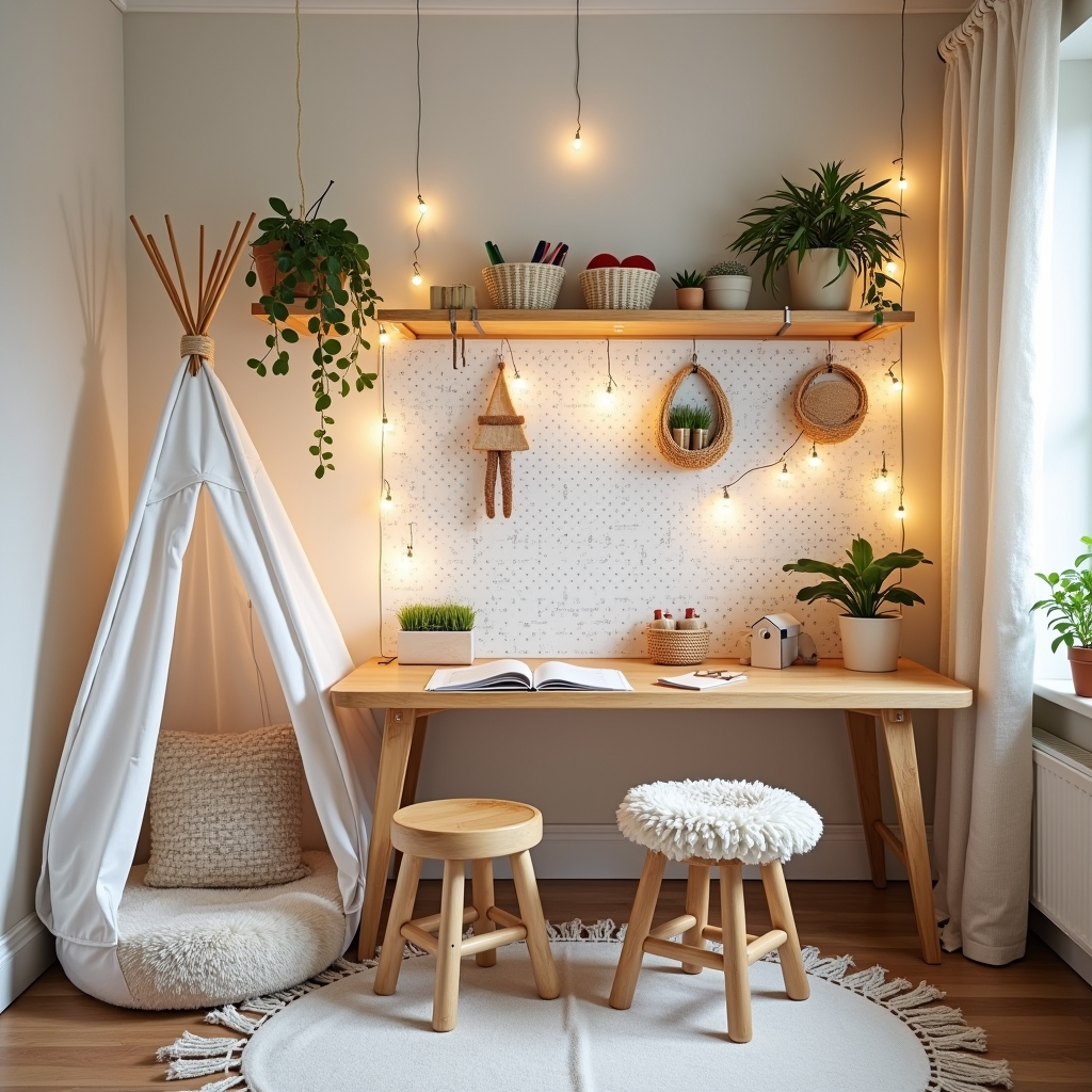 A cozy tent corner uses a white pegboard to organize art supplies and decorations. A natural wood desk and matching stools give children a dedicated workspace. Wooden shelves and hooks hold baskets, plants, and toys. Soft curtains and whimsical lighting create a magical fort where creativity can flourish.