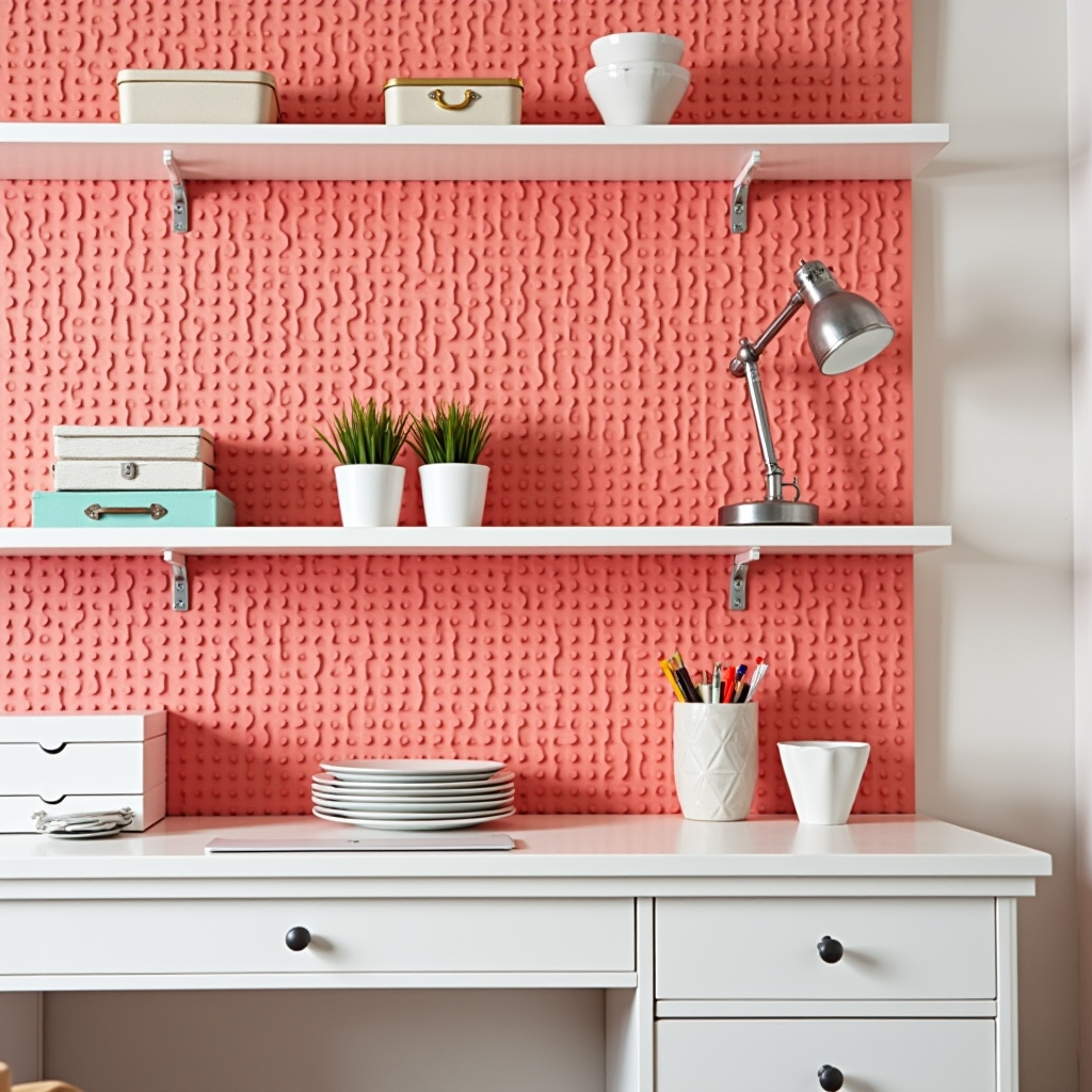 Vibrant coral pink pegboards add energy to a craft setup. White shelves and containers provide contrast, keeping the space visually balanced. Bright desk accessories complement the colorful backdrop. This look can be recreated in any bold color that matches your personal style.