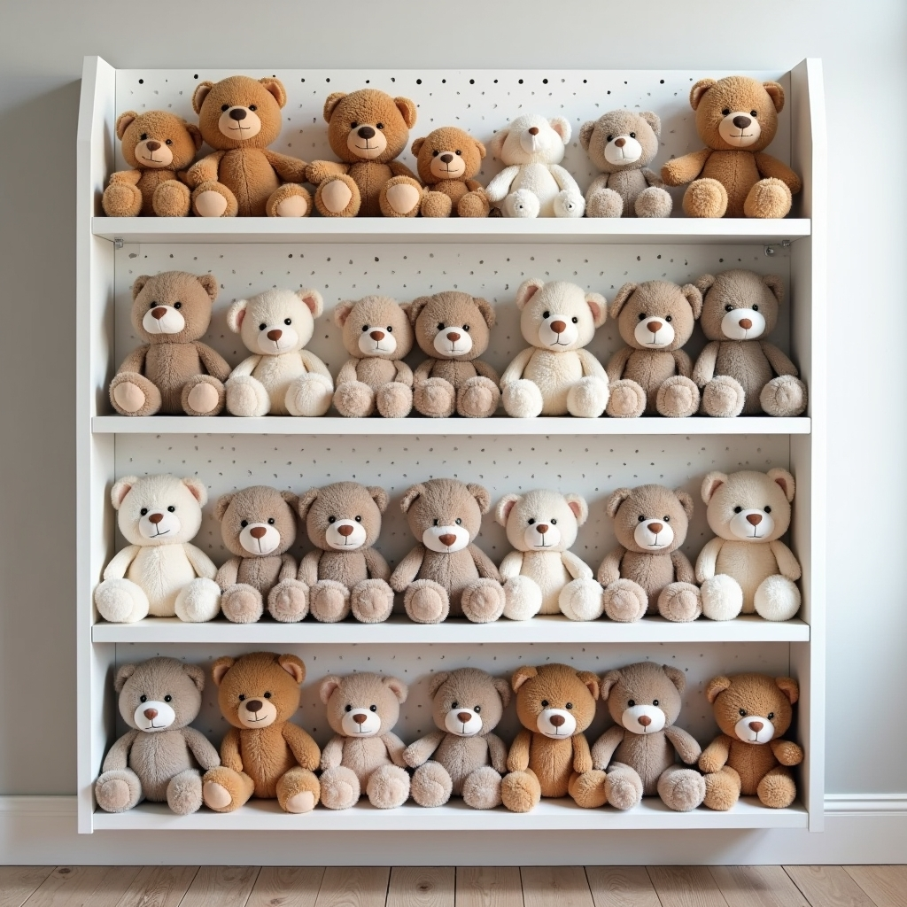 White pegboard shelves create a cozy display area for plush toys. Different shelf depths accommodate various sizes, making seasonal swaps easy. Multiple tiers provide flexible storage while keeping collections organized and dust-free.