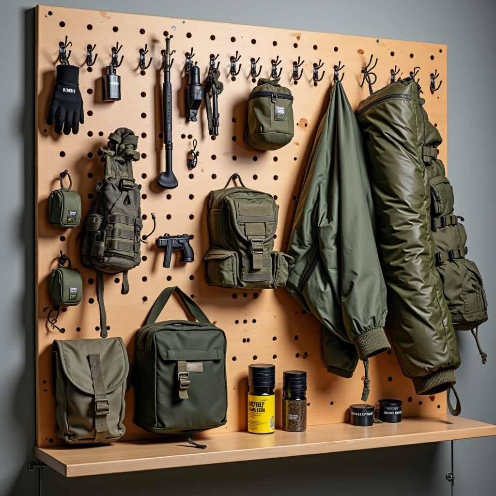 A large birch pegboard organizes tactical gear with multiple hooks and hanging options. Gloves, compasses, sleeping bags, and pouches are all kept within easy reach. This system can be adapted for camping gear, photography equipment, or craft supplies by changing hooks and containers.