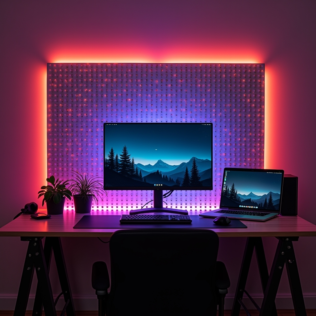 RGB LED strips behind a pegboard create dramatic backlighting for gaming or craft setups. Adhesive strips are affordable and easy to install, and the spacing between the wall and pegboard allows light to spread evenly. Color-changing options enhance the mood and ambiance of the space.
