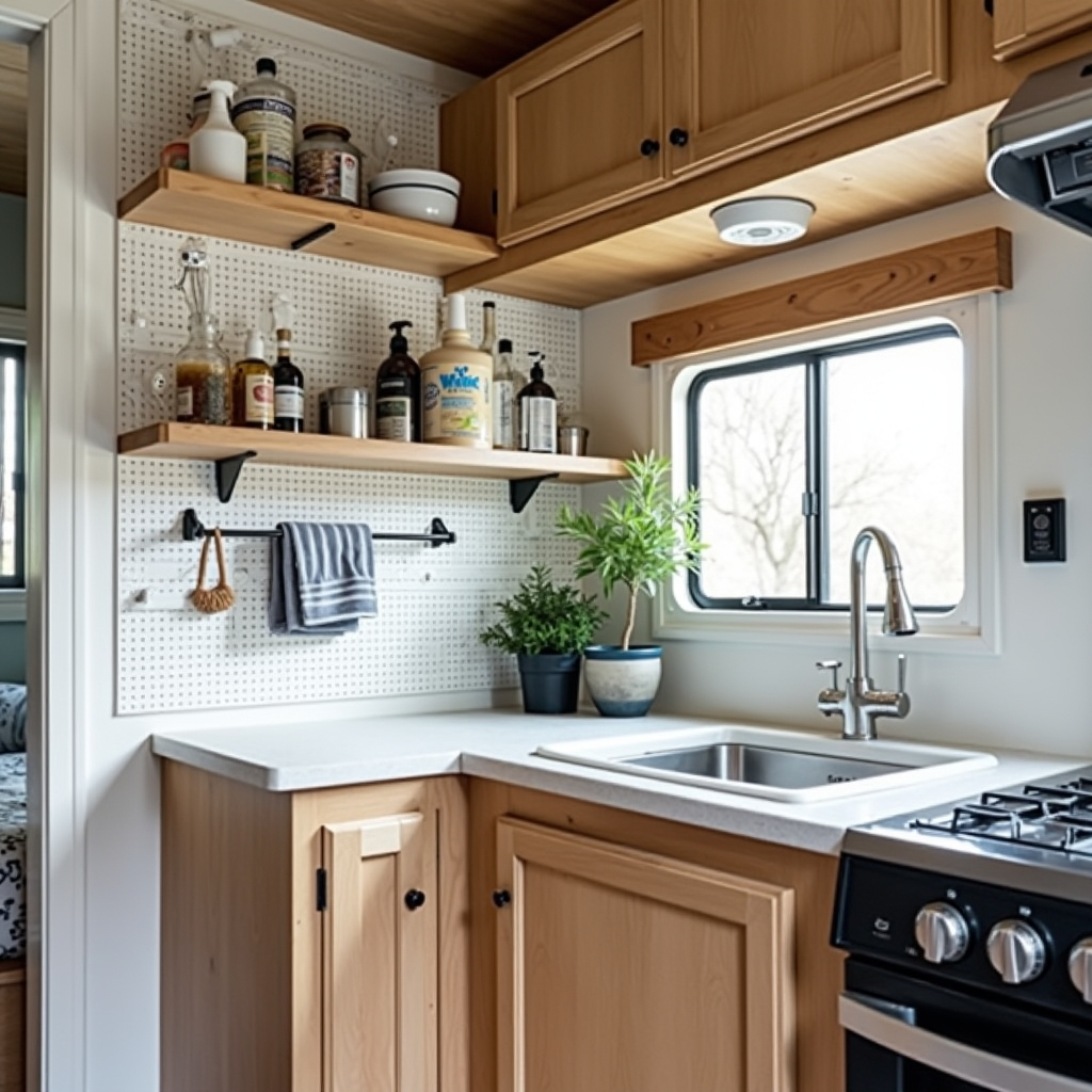 A corner pegboard in an RV kitchen maximizes vertical space without crowding the sink. Shelves and hooks store cleaning supplies and towels while maintaining a clean aesthetic. Even small kitchens can benefit from creative pegboard placement.