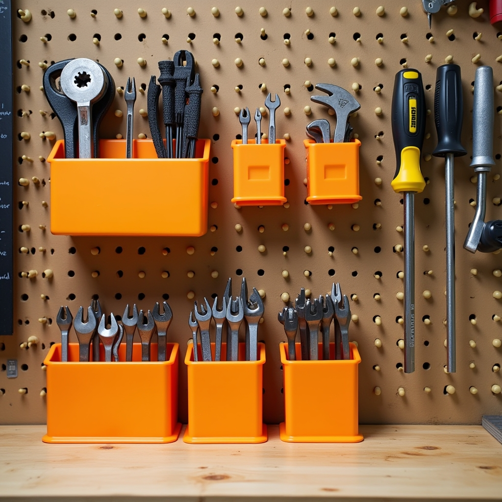 3D-printed pegboard containers organize tools by size and type. The bright contrast between the holders and pegboard makes tools easy to find. Compartments accommodate both large and small items, and custom sizes/colors allow full personalization for any workshop.