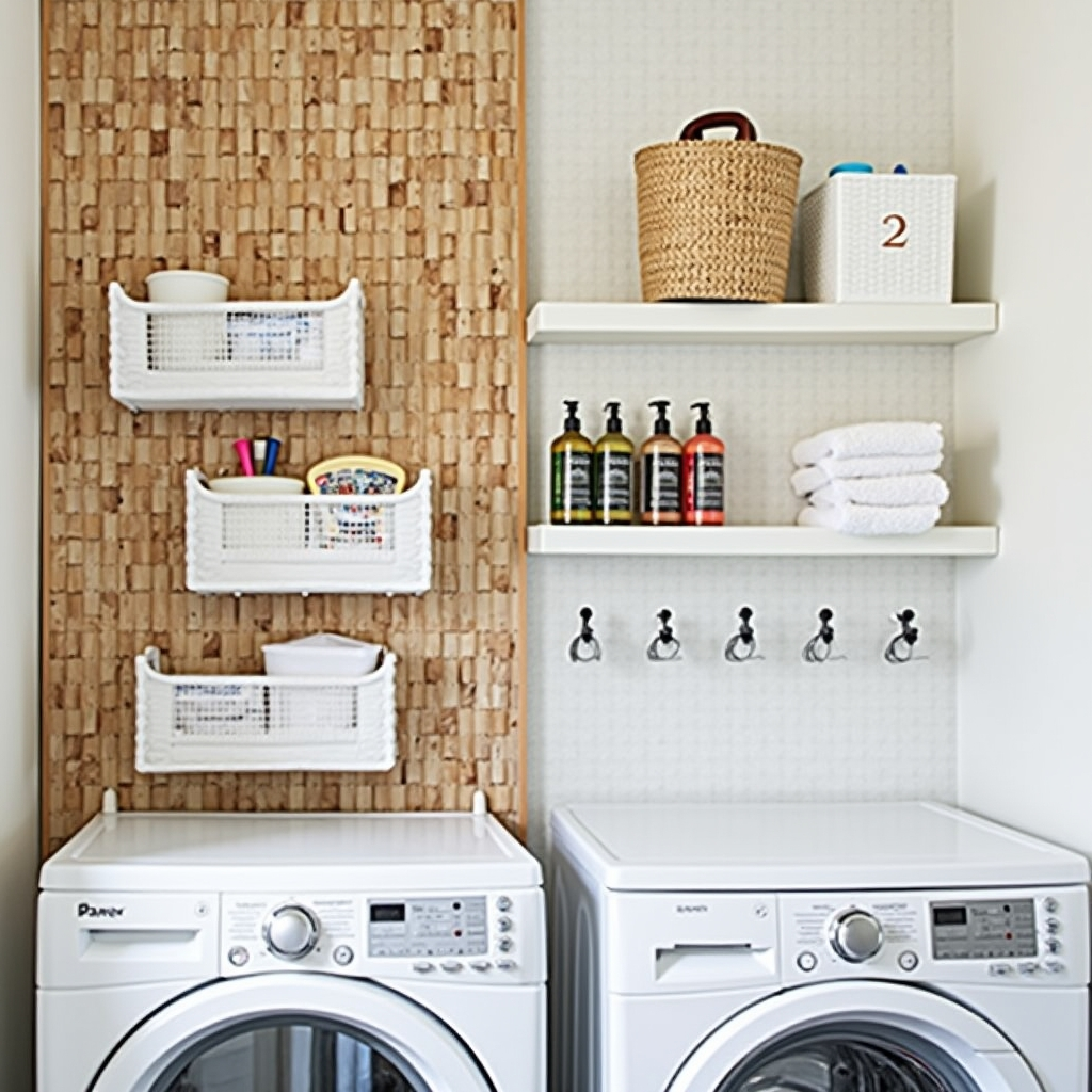A natural wood pegboard brings warmth and texture to a small laundry corner. Classic white accessories and bins keep supplies organized. Staining a standard pegboard in honey or natural tones and adding hooks creates a functional mini command center without taking up counter space.