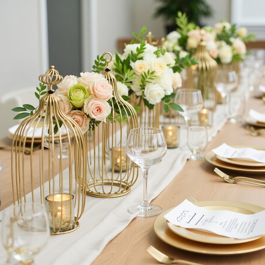 For a practical and cost-effective option, consider using artificial flowers from Ikea. This ensures the centerpiece remains beautiful throughout the event and can be taken home afterward as a keepsake. These cages work perfectly for long tables, buffet areas, or even as part of a decorative entryway, providing a luxurious touch without a hefty price tag.