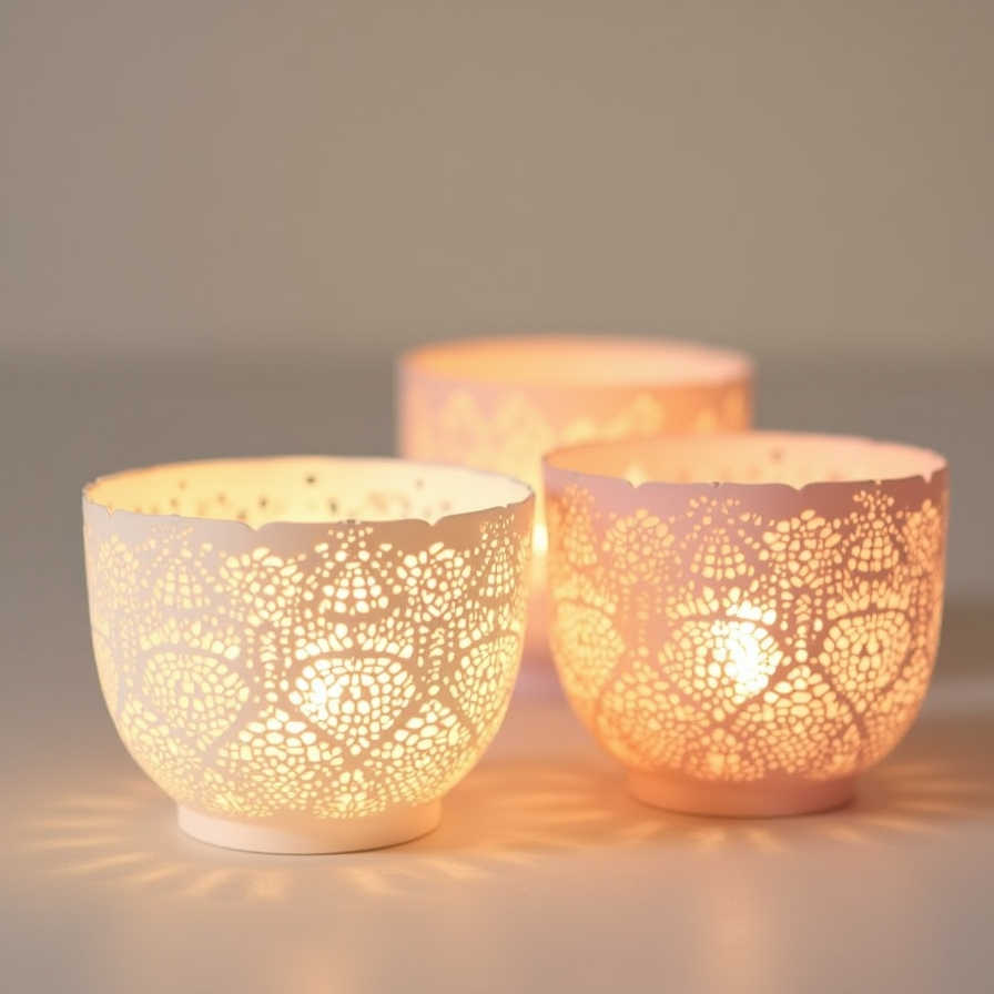 Shades like soft peach or blush pink introduce warmth and complement summer or spring weddings. Positioned along tables or on mantels, these tea light holders create a romantic ambiance. The lace pattern’s dappled light adds a layer of elegance that makes even a small table arrangement feel refined and luxurious.