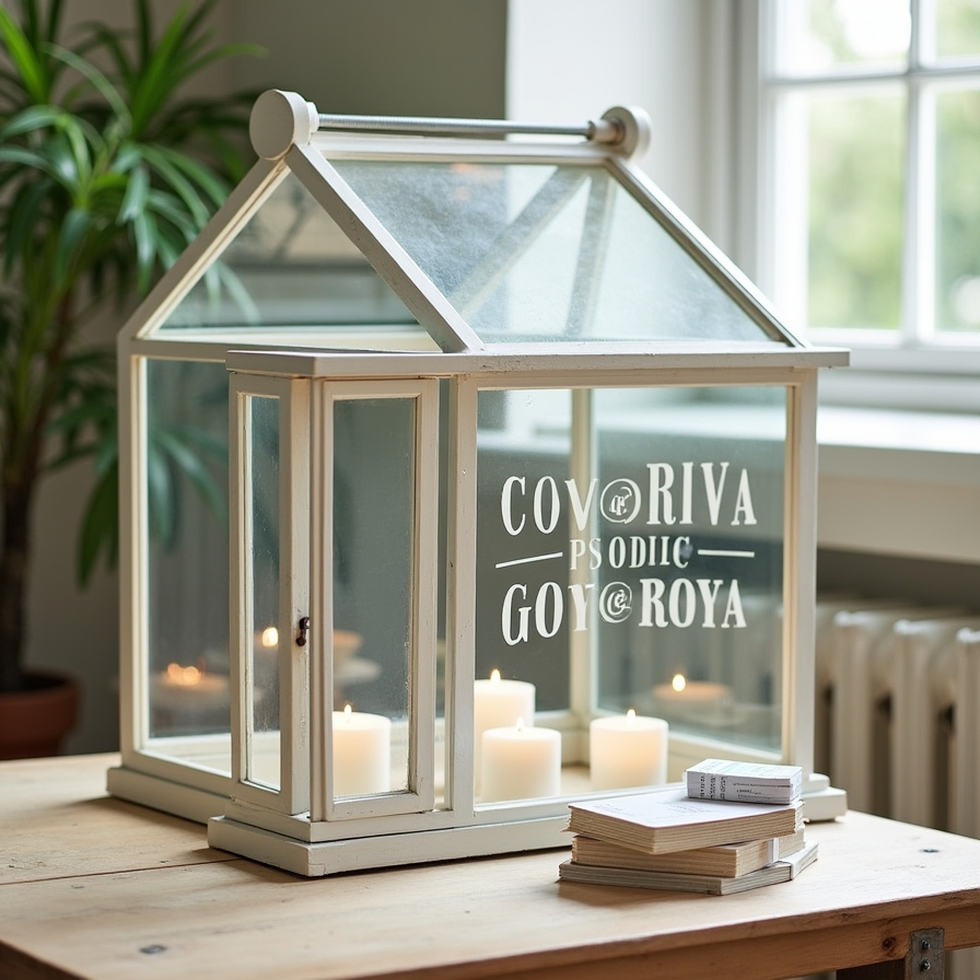 Repurposing an Ikea SOCKER indoor greenhouse as a wedding card box offers both style and functionality. Adding a personal message on the glass with a glass pen or decals makes it easy to customize.