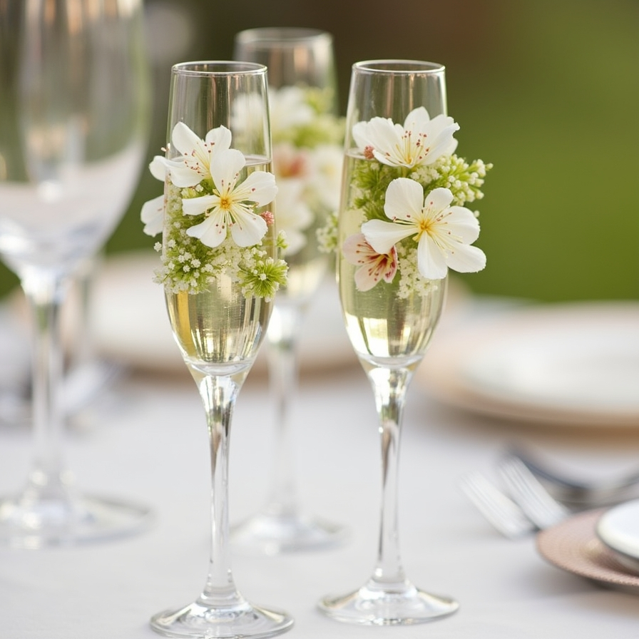 Decorating champagne coupes with small floral arrangements adds a whimsical touch to wedding tables. However, practicality is key—too much foliage can interfere with drinking.
