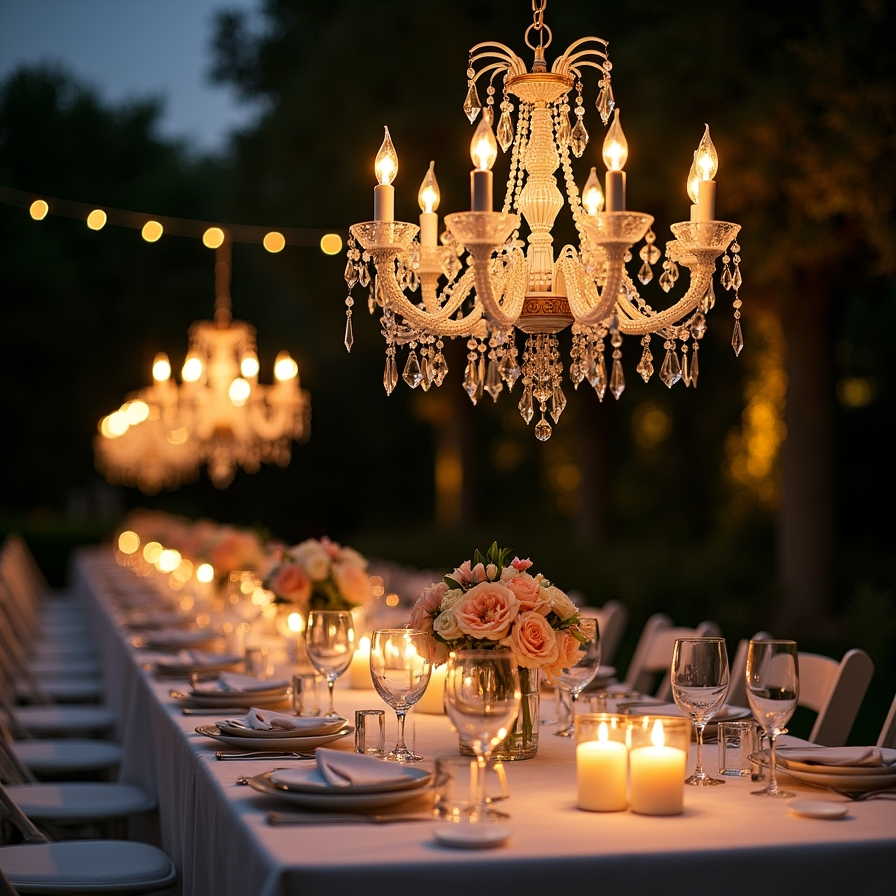 These chandeliers serve as striking centerpieces that double as functional lighting. Adding battery-powered LED candles ensures safety while creating a warm, romantic glow across the tables.