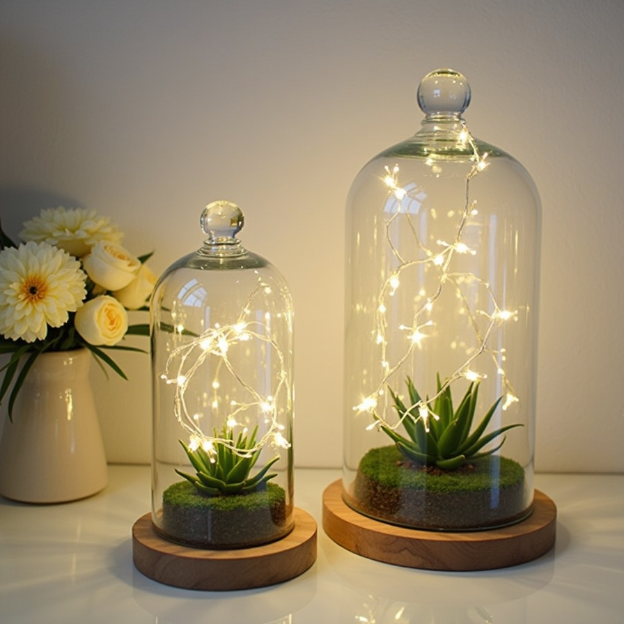 You can also use moss, succulents, or other decorative fillers inside the domes. Battery-powered lights make them versatile and easy to position anywhere without worrying about cords.