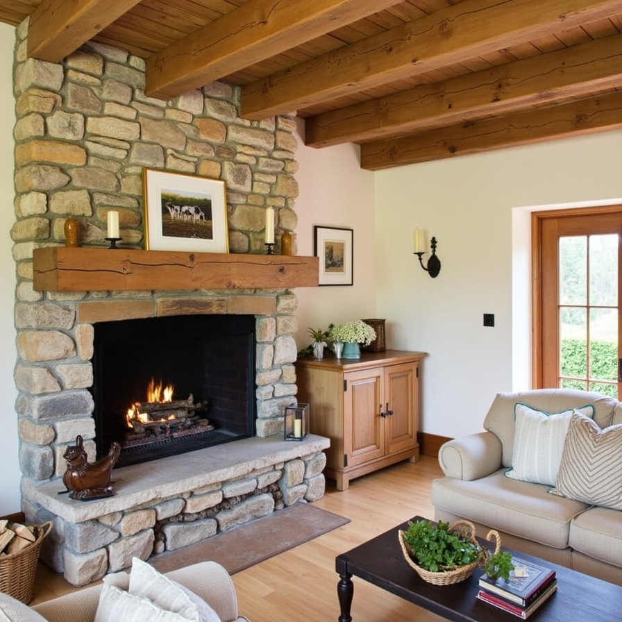 To enhance the cottage atmosphere, place a basket filled with firewood beside the hearth or add a comfortable armchair nearby. This combination creates a space that feels perfect for relaxing on a cool evening. The natural materials of wood and stone help anchor the room while reinforcing the rustic charm associated with traditional Irish homes.